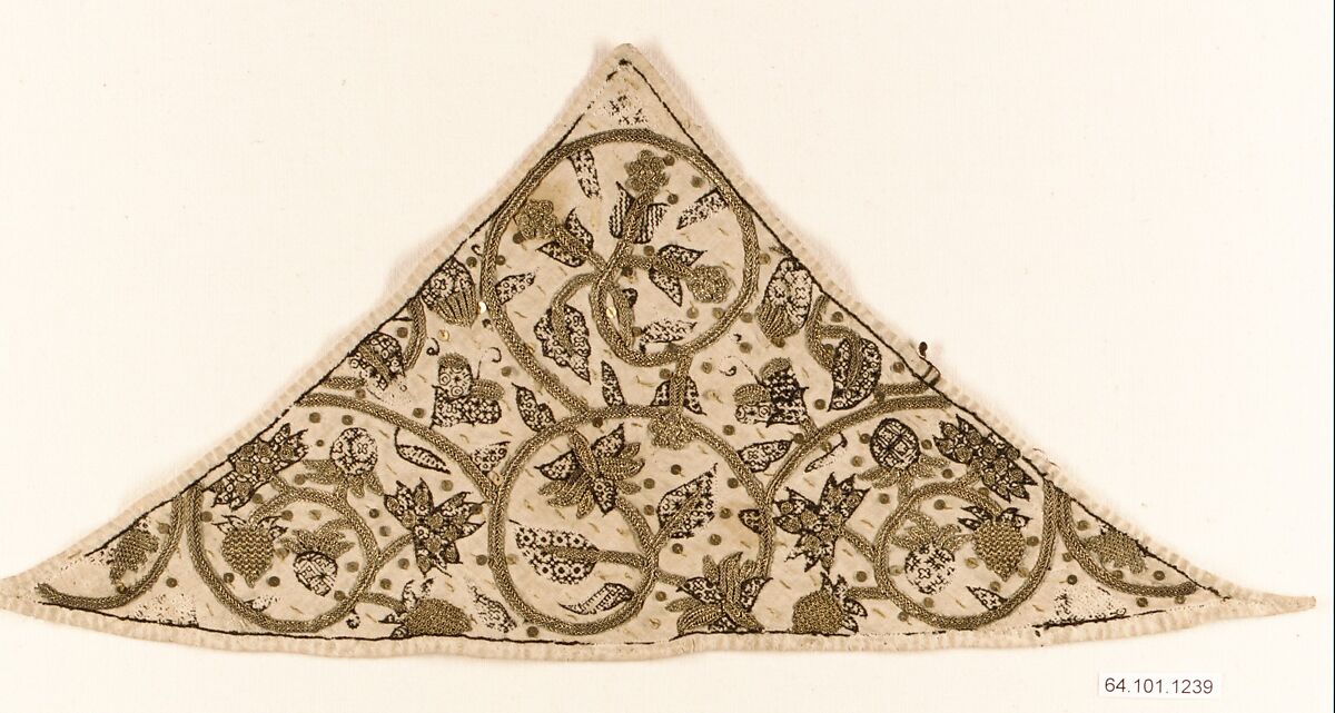 | Triangular forehead cloth, embroidered, last quarter 16th century, in The Met. |